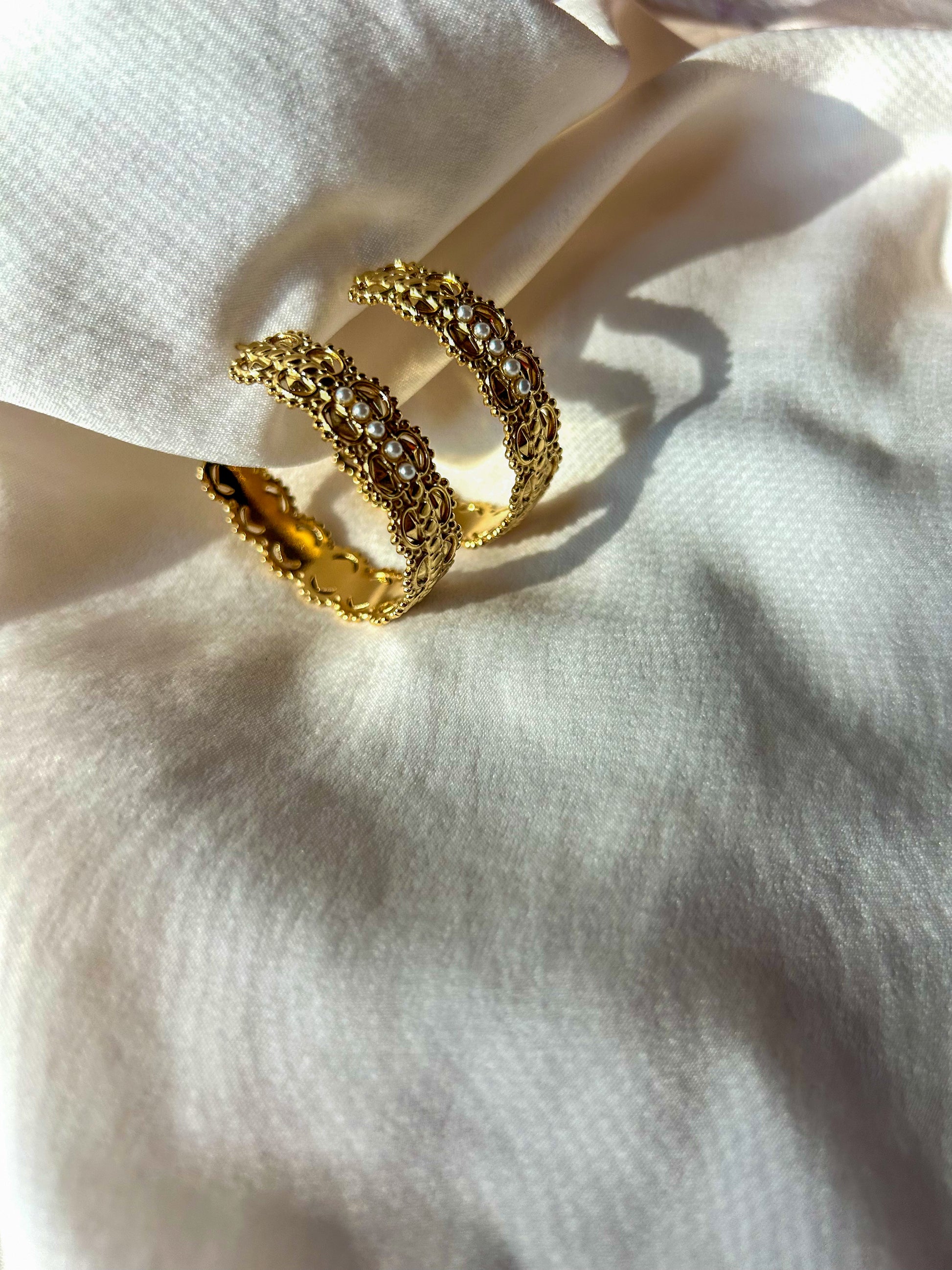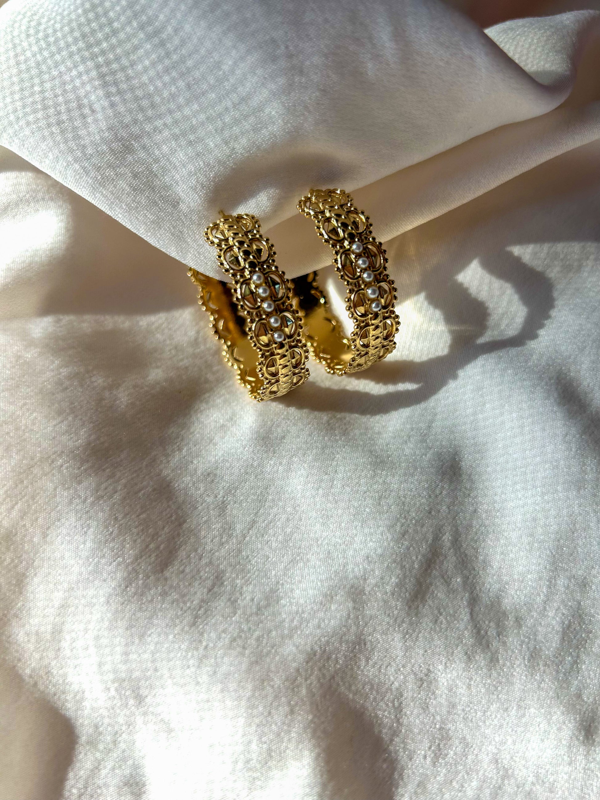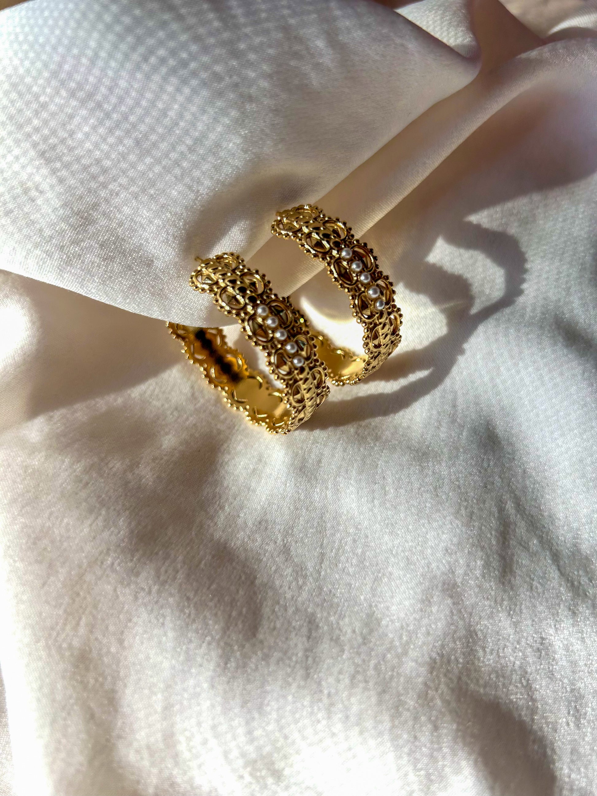 Stainless Steel Hoop Earrings with open work shapes and small pearls.