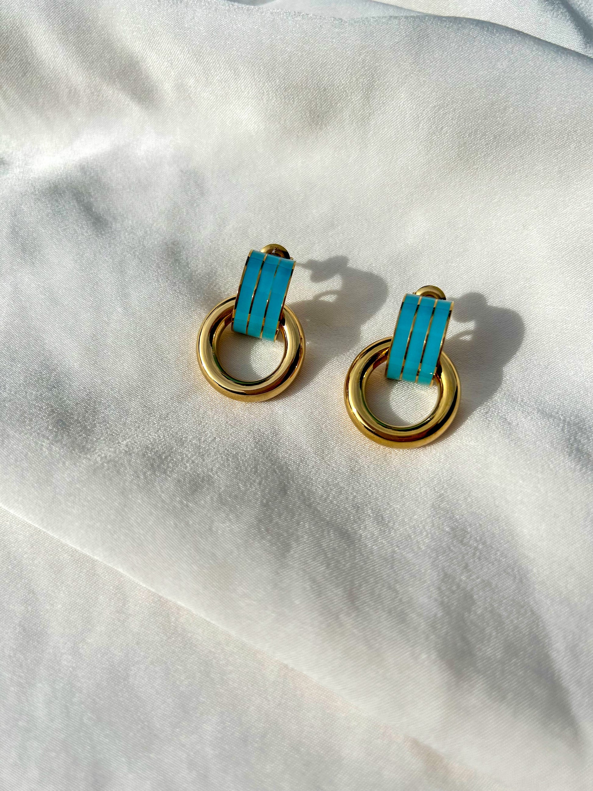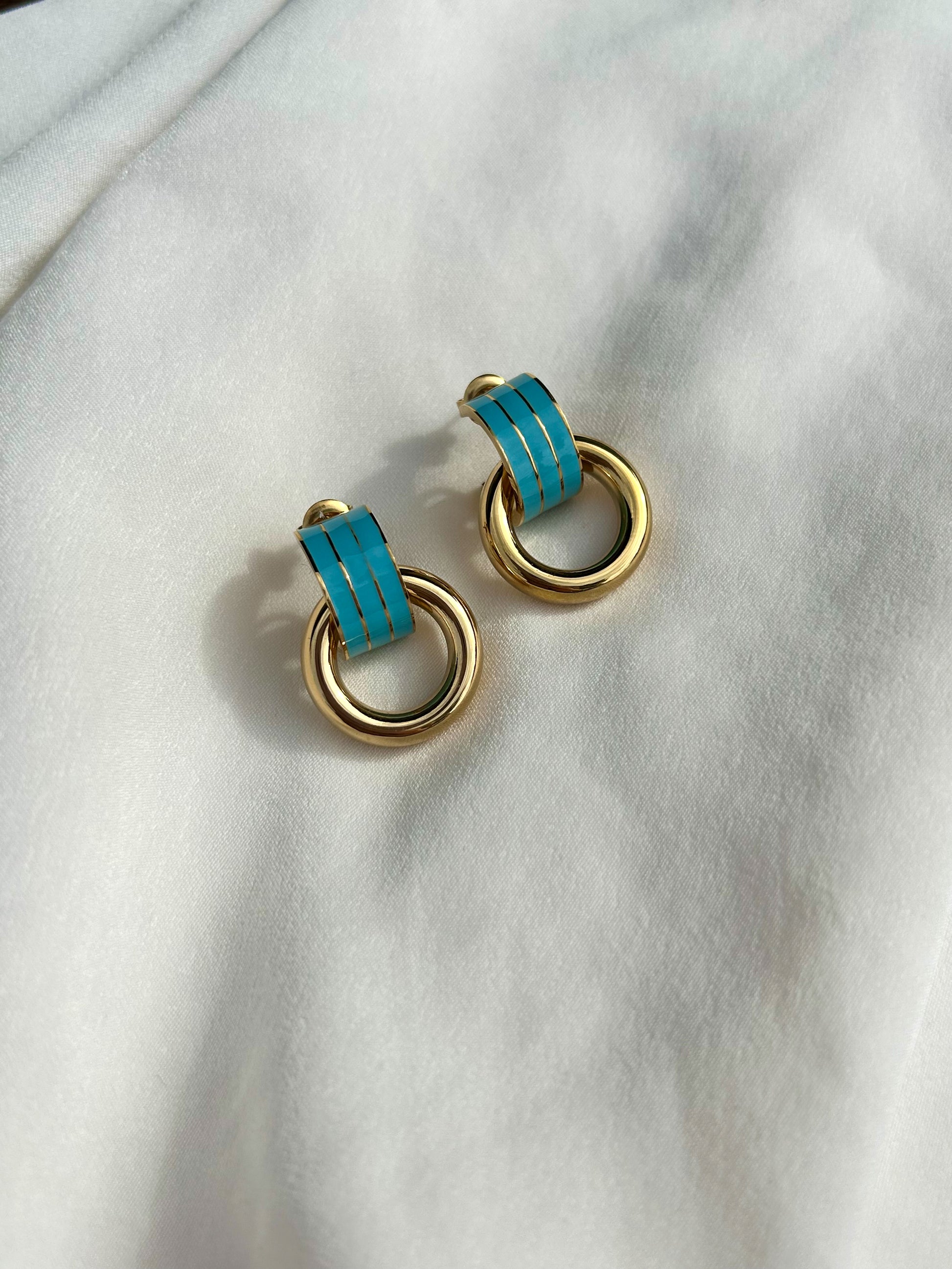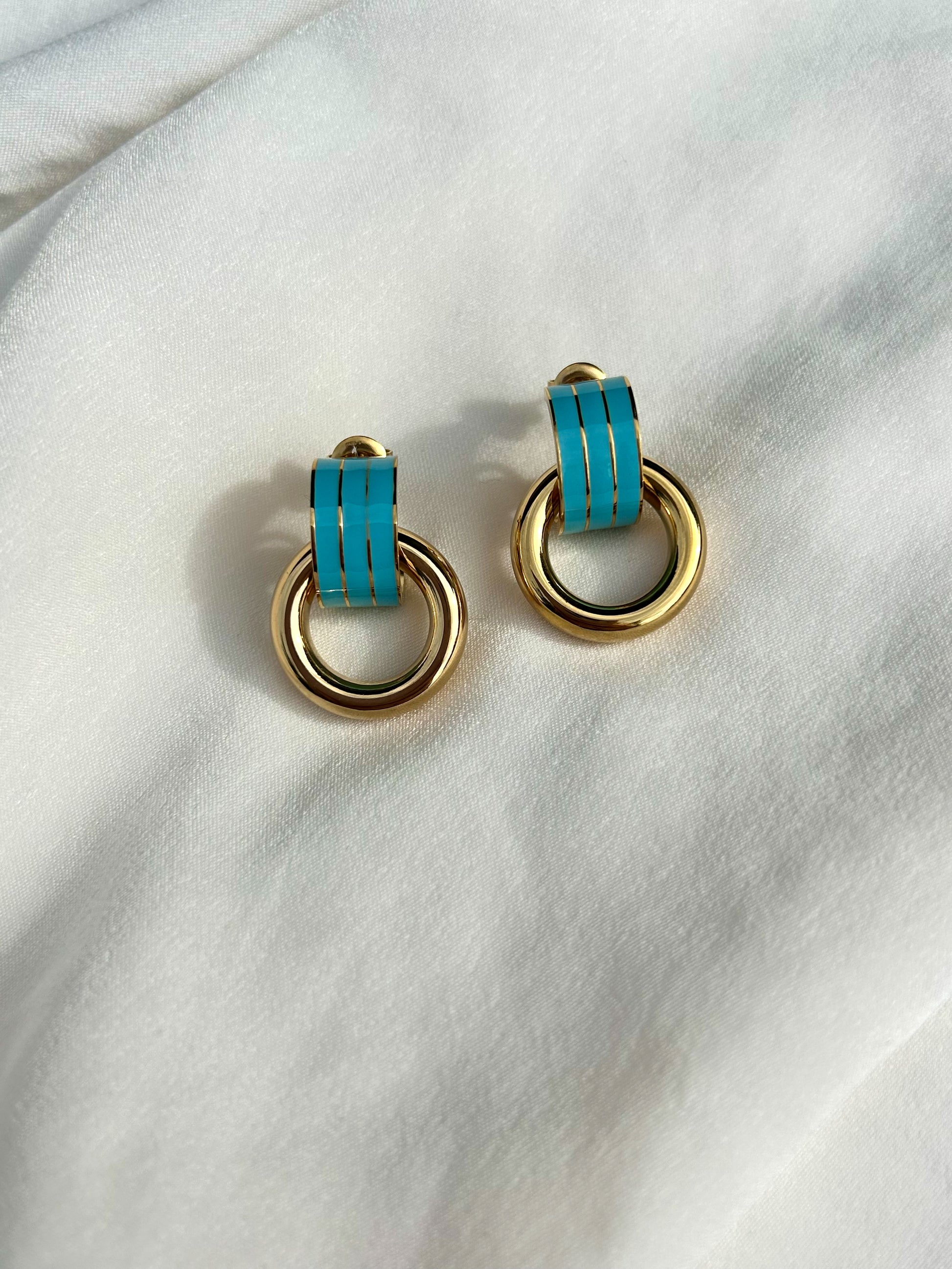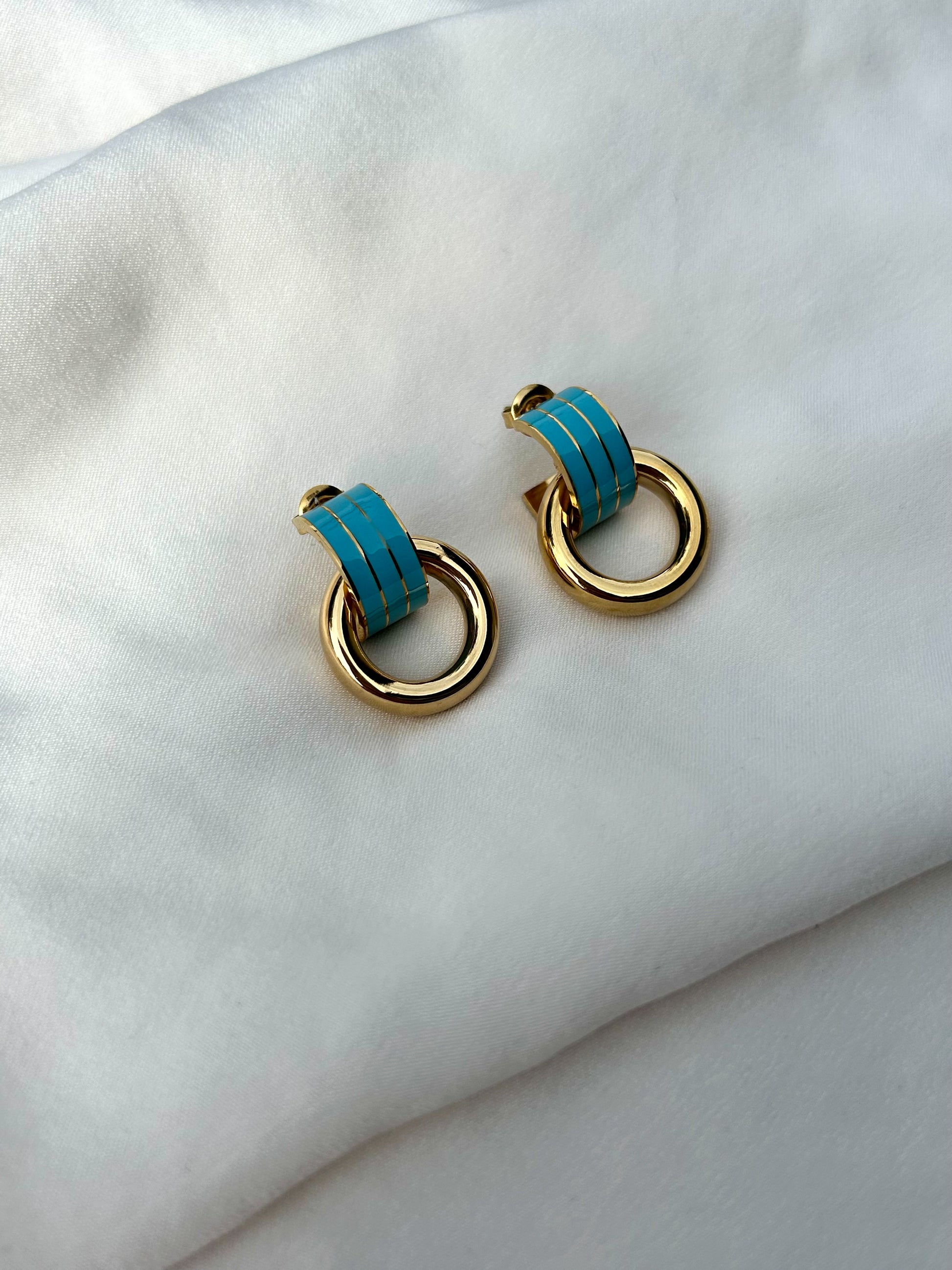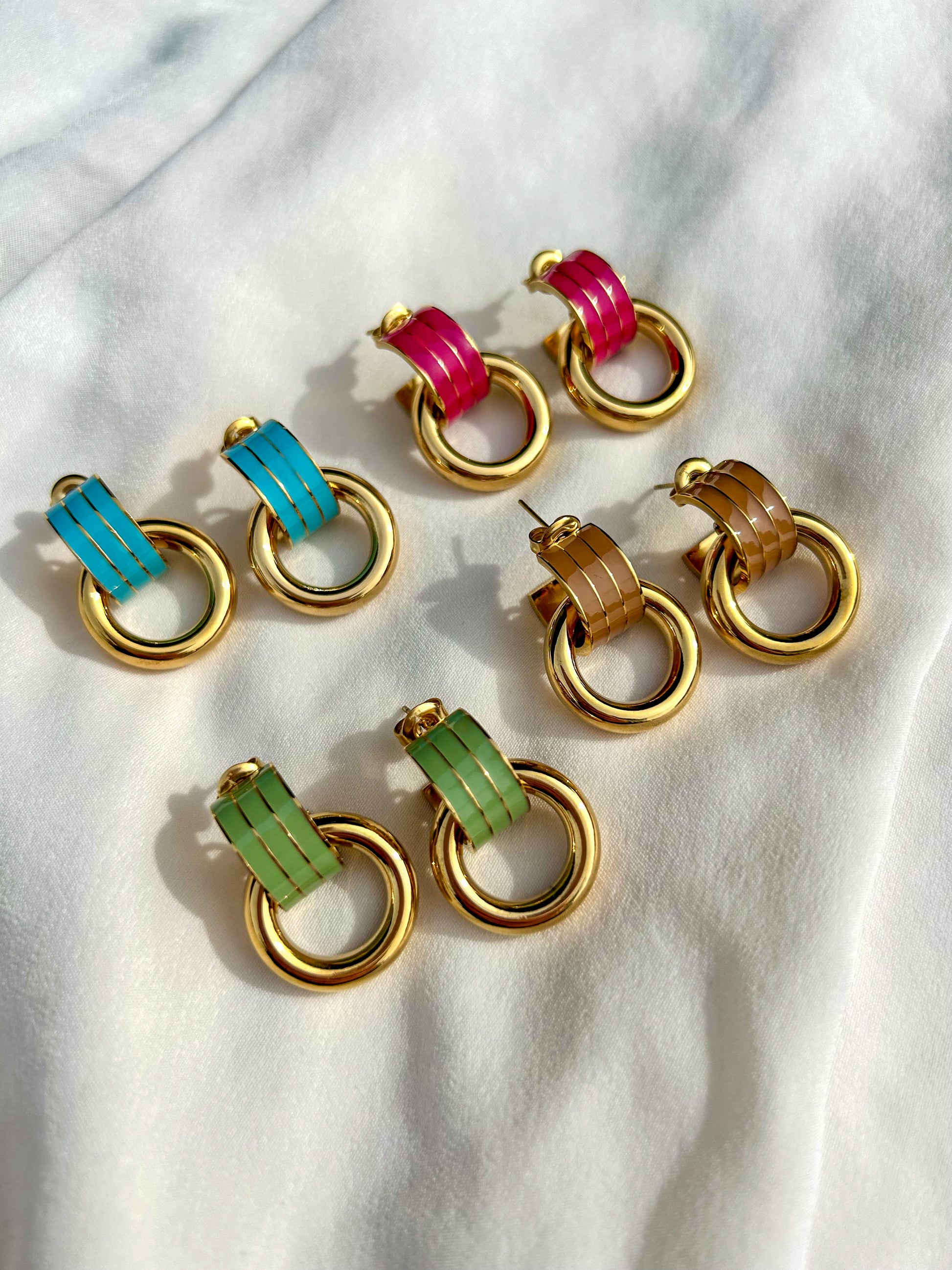 Stainless steel hoop earrings composed of two inserts, a colored enamel half-hoop and a thick hoop.