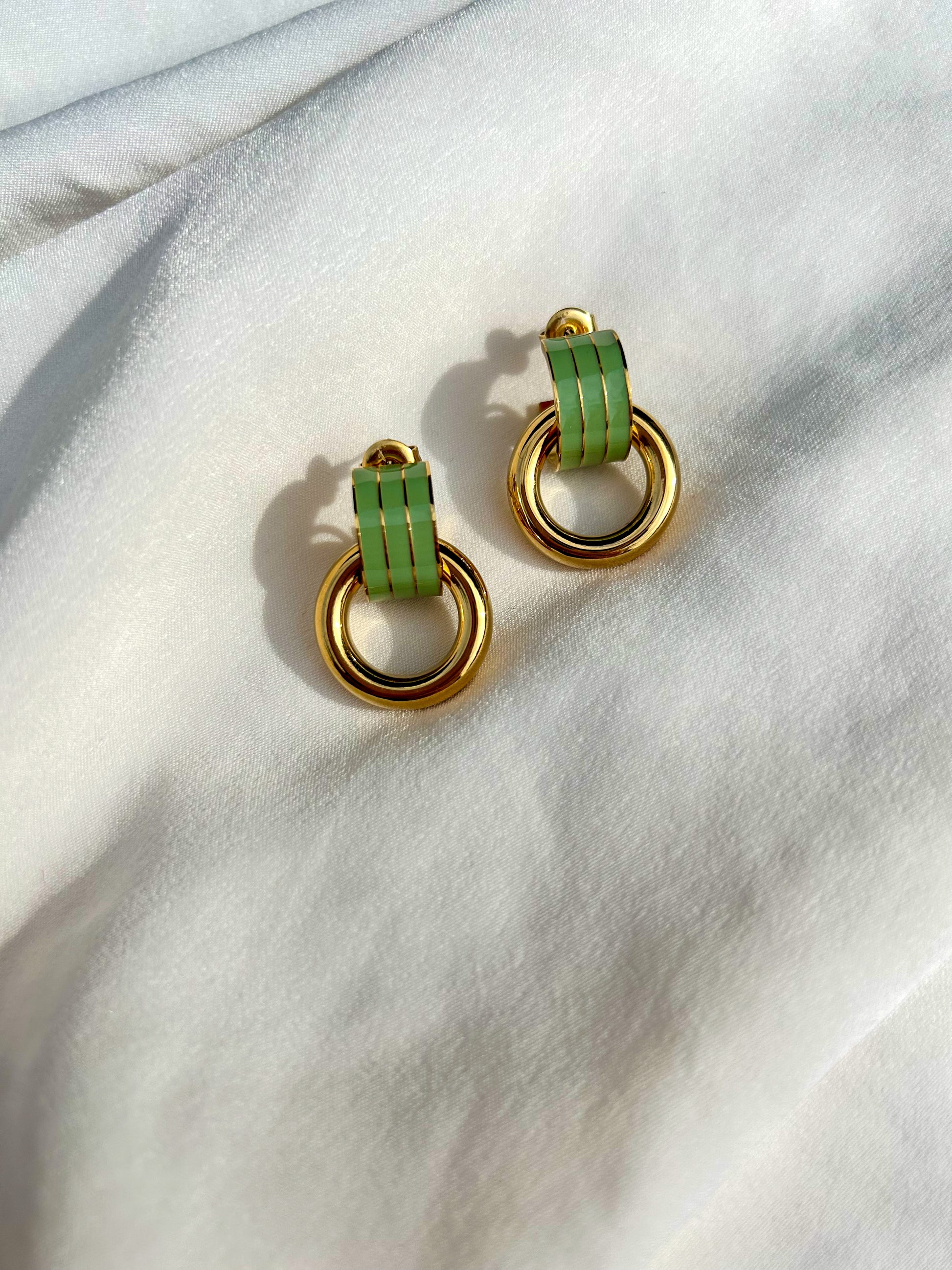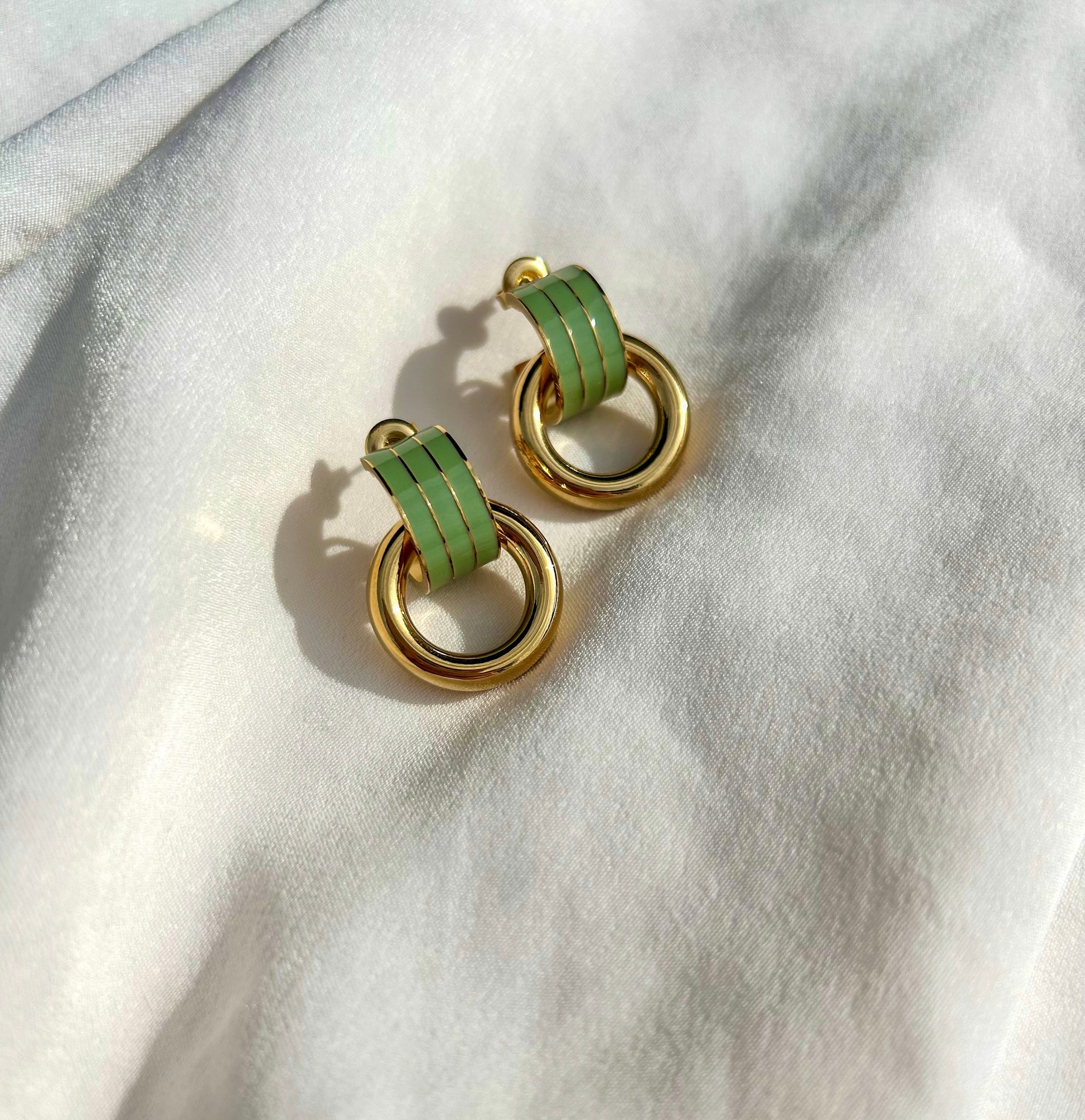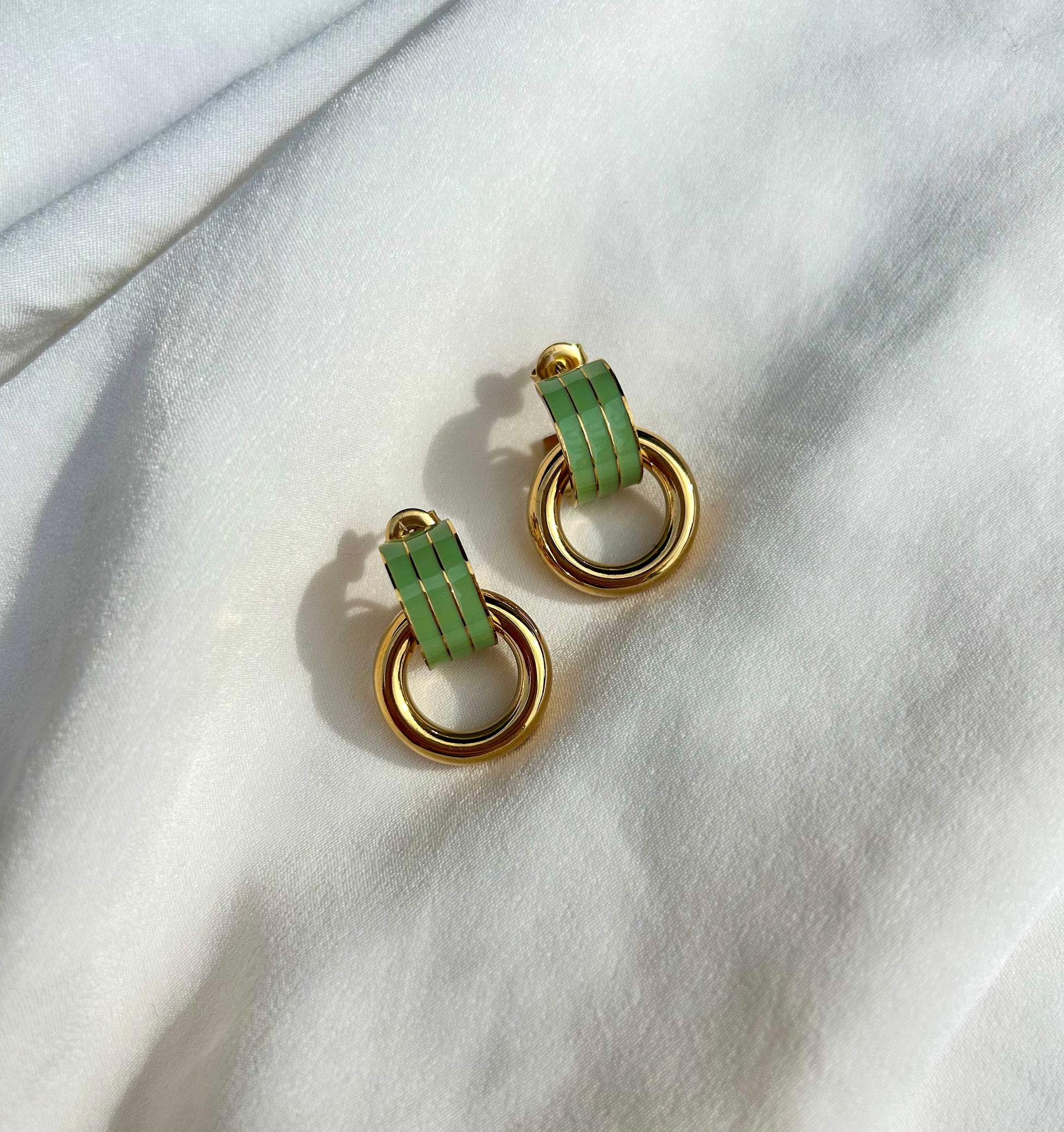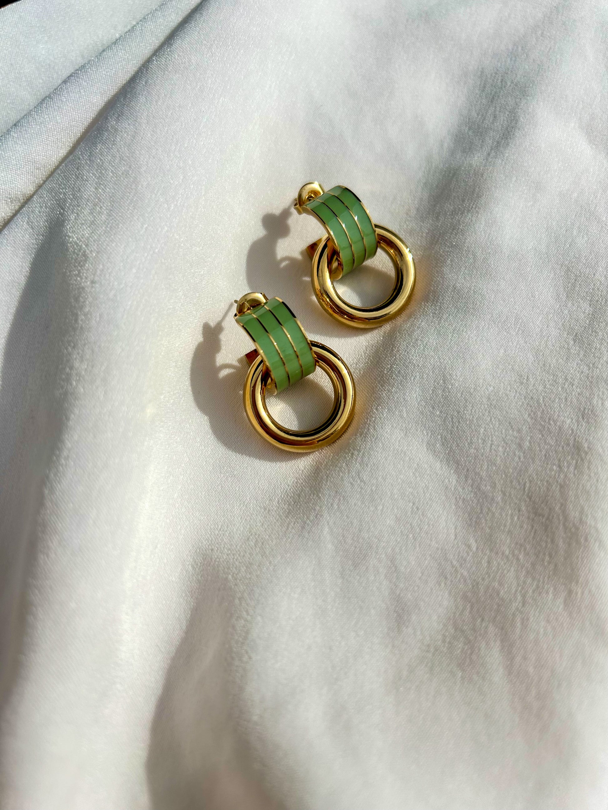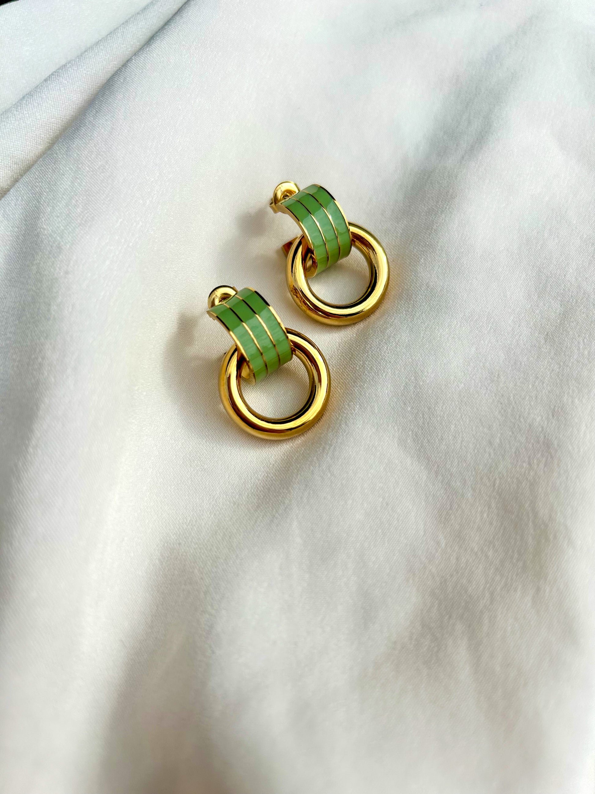 Stainless steel hoop earrings composed of two inserts, a colored enamel half-hoop and a thick hoop.